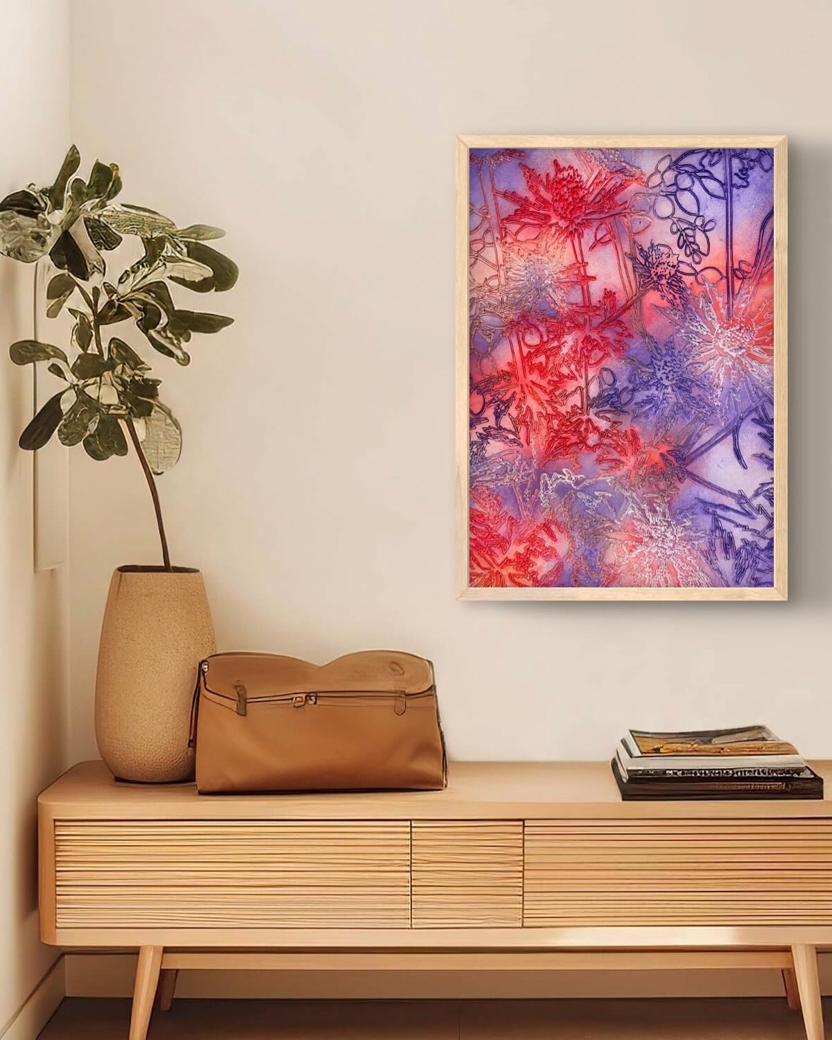 “Passio” is a celebration of wild forms, colour, and quiet intensity. I loved painting this piece, and it was a delight to have it selected for the exhibition “The Heat Is On” at The Art Room in Leamington Spa. This collection features diverse works from talented local artists, and I’m proud to be a part of it.